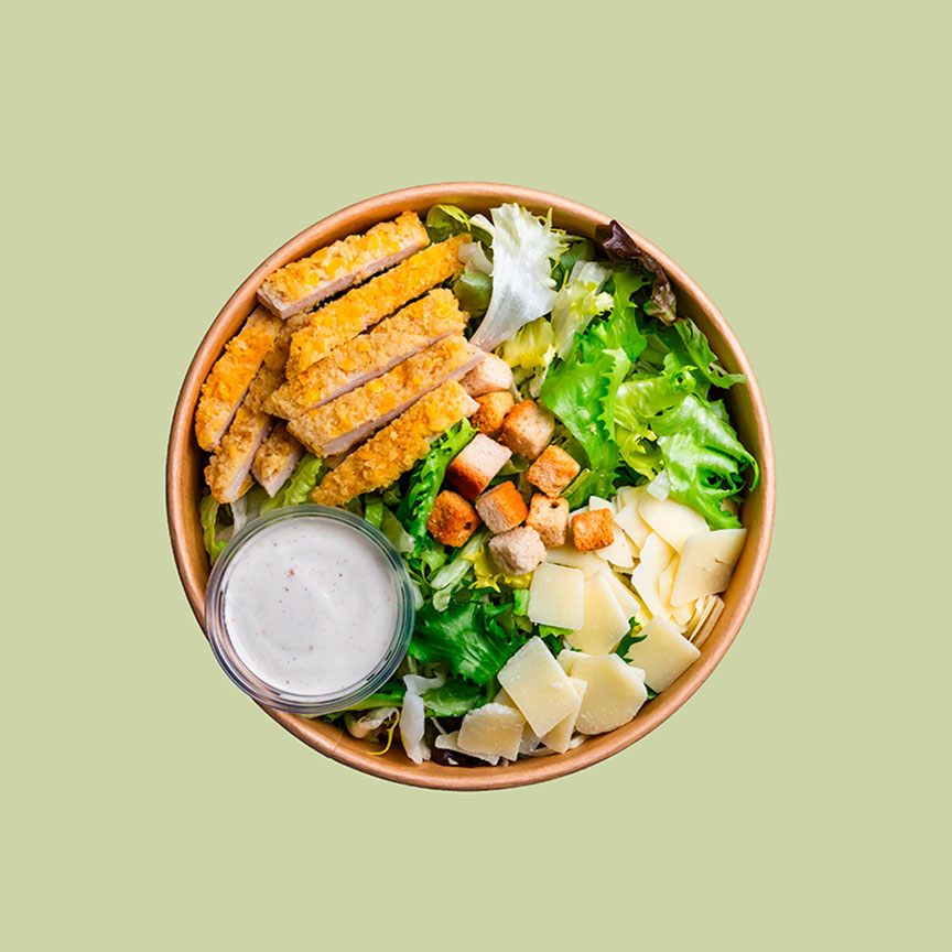 Mezcla de lechuga variada, pollo empanado, salsa cesar, queso en lascas, pan tostado