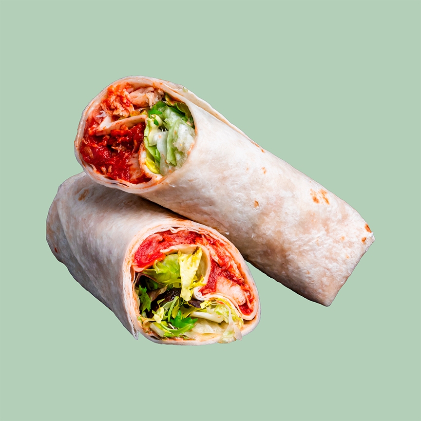 Pan tortilla de trigo, mezcla pollo tex mex, mezcla verduras asadas, mezcla lechuga variada, salsa tex mex
